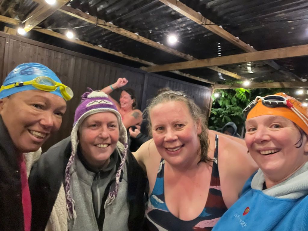 Mindful that a two-hour swim can constitute a marathon, and having seen the natural athleticism of the other teams, I sought to find my own rhythm and ensure I swam my own race. I was conscious that a wobbly course can add minutes onto the 200m time and concentration had to be devoted to looking up and focussing on the next buoy. During the briefing, we had been warned about the slippery matting at the exit point and warned to swim as close to the exit – it was at this point we were swept up into the hulking arms of Jim, who gave just enough time for the feet to touch solid earth before being sending me in a sling shot up the ramp to high five Jane, who was leg four. A call to the lap counter with the name of our team (Two bras and no knickers) never failed to elicit a smile, even on the 23rd repetition before the attempts to keep warm and the repeat 200m.